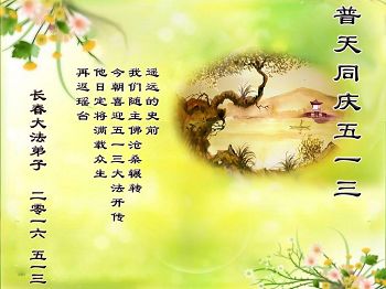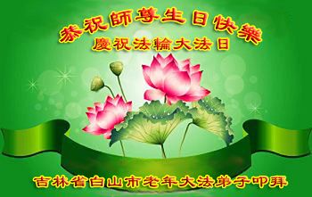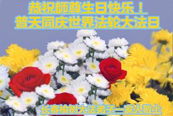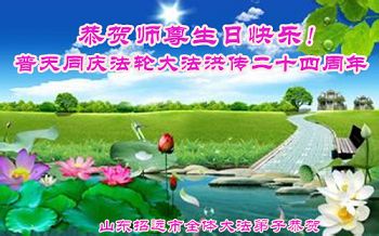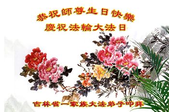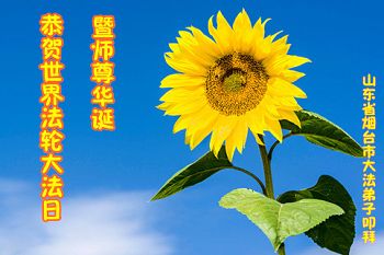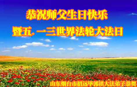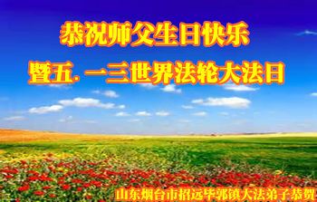 山東煙台開發區一家大法弟子慶祝世界法輪大法日,叩拜師父生日快樂!