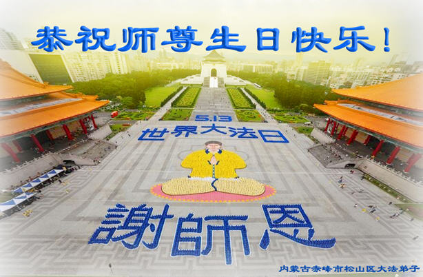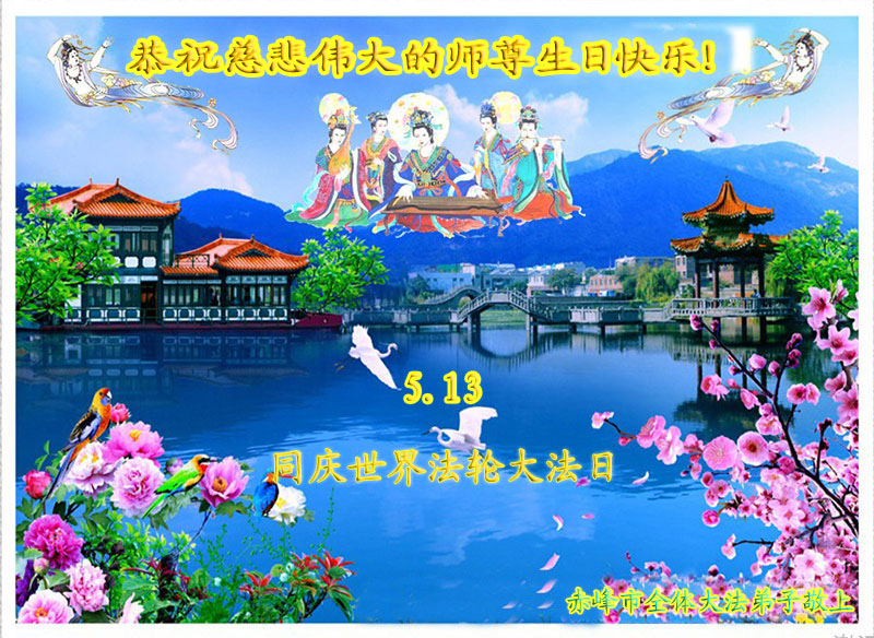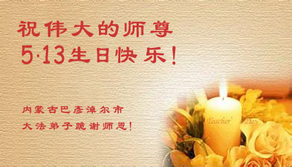中國大陸內蒙古赤峰市橋北全家大法弟子向慈悲偉大的師尊問好!在5.13即世界法輪大法日之際,恭祝師父生日快樂!法輪大法好!真善忍好!師父好!我們全家大法弟子聽師父的話,做好師父讓做的三件事,兌現史前誓約,走好最後人成神之路。
