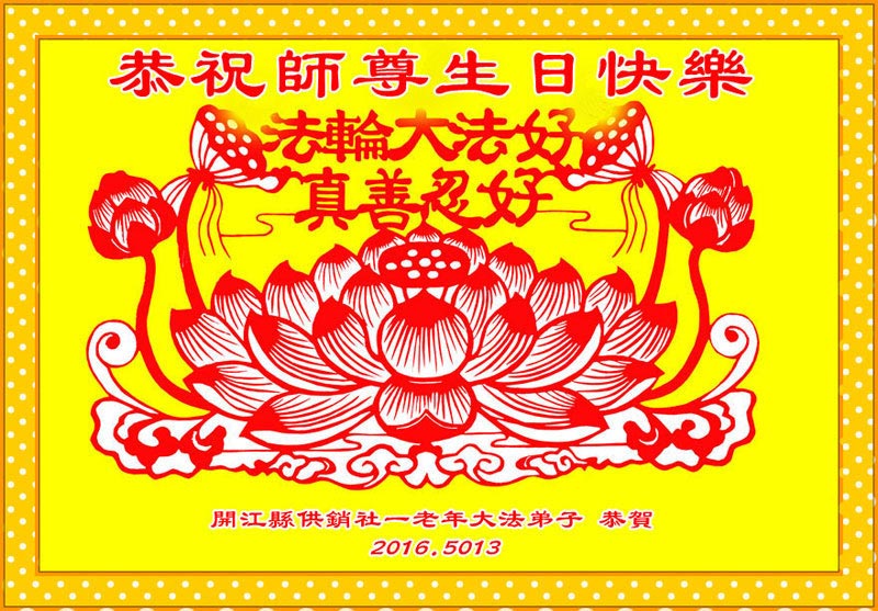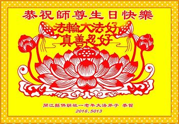 達州市開江縣原二輕系統一老年夫妻大法弟子及家人恭祝慈悲師尊生日快樂!