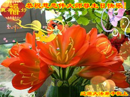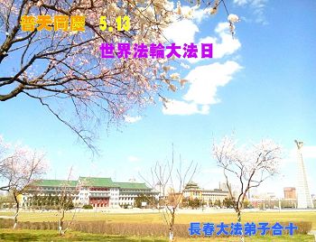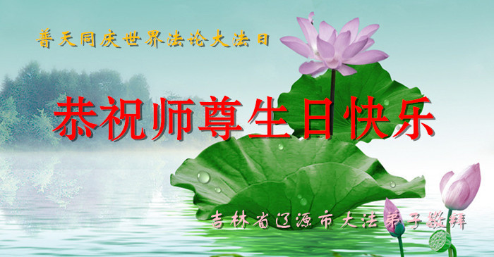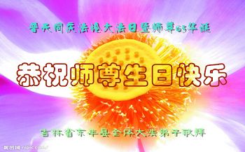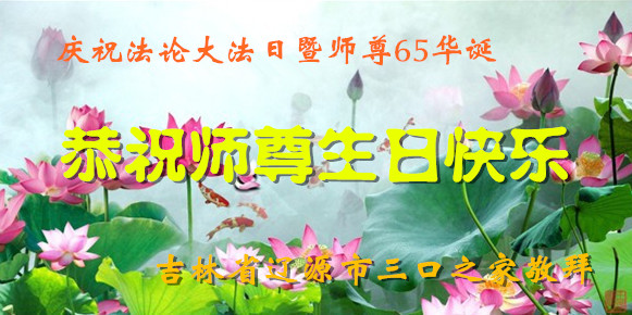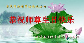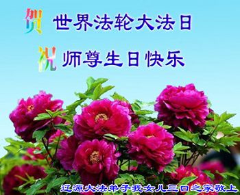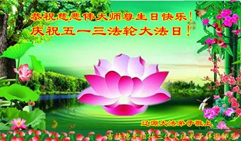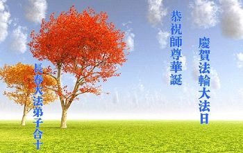 值此神聖的法輪大法日來臨之際,我們夫妻同修恭祝偉大的師父生日快樂!慶祝法輪大法日洪傳世界十七週年,弟子盼望能與師父早日團聚。願天下更多的眾生明白大法真相,脫離苦海,真正得救。