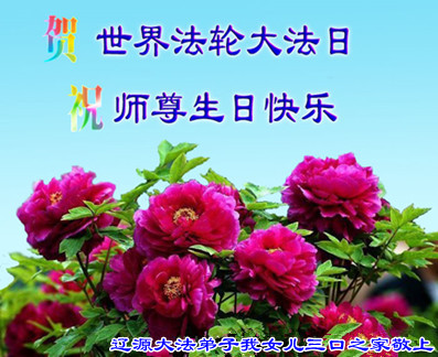 值此世界法輪大法日之際,我們一家遙祝師尊生日快樂!在餘下的日子裏,我們真正修好自己,盡最大的努力去救度有緣眾生,願師父少一份操勞,多一份安慰。