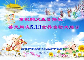 四川省成都市新津縣全體大法弟子恭祝師尊生日快樂!恭賀法輪大法洪傳世界二十四週年!感恩師尊的慈悲救度!