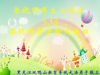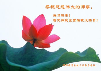 在第十七屆「世界法輪大法日」暨師尊六十五歲華誕來臨之際,蒼穹寰宇洪恩浩蕩,普天同慶!全世界大法弟子共同歡呼:法輪大法好!真善忍好!恭祝師尊生日快樂!在末劫大難來前,感恩偉大的師尊慈悲苦度,感恩大法洪傳救好人回天,感恩創世主救度宇宙萬物於毀滅間,感恩的語言無法表述。大法弟子唯有勇猛精進,不負使命,兌現誓約,助師正法,做好三件事,多救人才能完成自己的史前大願,圓滿隨師返家園。慈悲偉大的師尊為蒼生付出的太多太多。謝謝慈悲偉大的師父!師尊您辛苦了!弟子合十