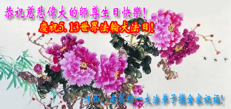 在「5•13」世界法輪大法日這個偉大神聖的節日裏,江西省鯉魚洲全體大法弟子向慈悲偉大的師尊問候生日快樂!今後一定走好最後的正法修煉之路,去掉最後的執著心,在大法中歸正自己,多救人,兌現自己的誓約,圓滿隨師還!