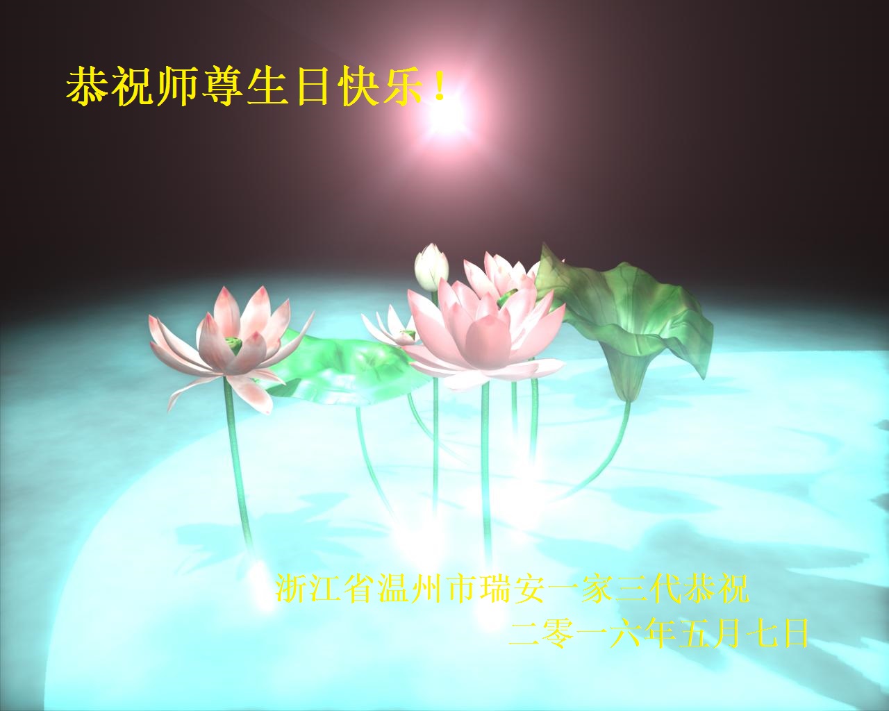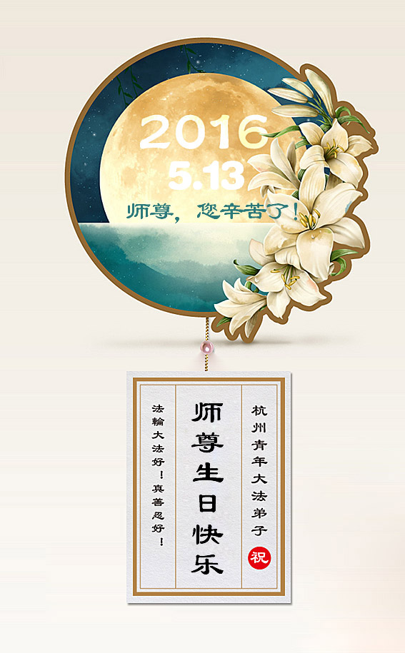 我們無比感謝師父救度之恩,在法輪大法的佛光普照下,使我們全家都在大法的沐浴中修煉,成為偉大師尊的弟子,無上榮耀。在此我們恭祝慈悲偉大師尊生日快樂!
