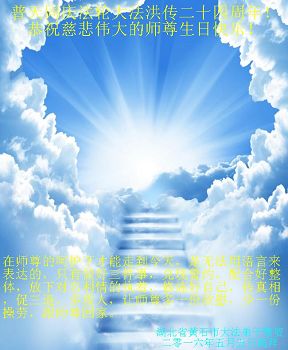我是得法晚的大法弟子,在五.一三世界法輪大法日即將到來之際,我恭祝師父生日快樂!恭賀世界法輪大法日!