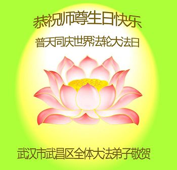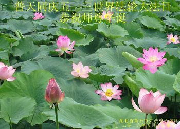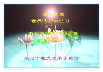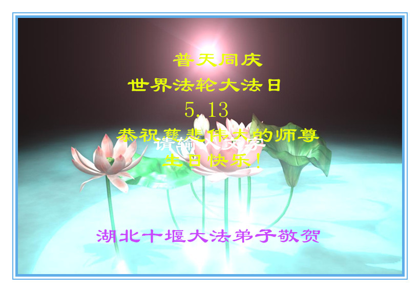 湖北十堰市大法弟子慶祝世界法輪大法日,恭祝慈悲偉大的師尊生日快樂!感恩師尊的慈悲救度,千恩萬謝無言以表!在正法即將結束的最後日子裏,弟子們將謹記師尊教導,認真做好三件事,肩負起正法時期大法弟子的責任,圓滿隨師回歸天國世界!