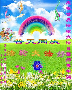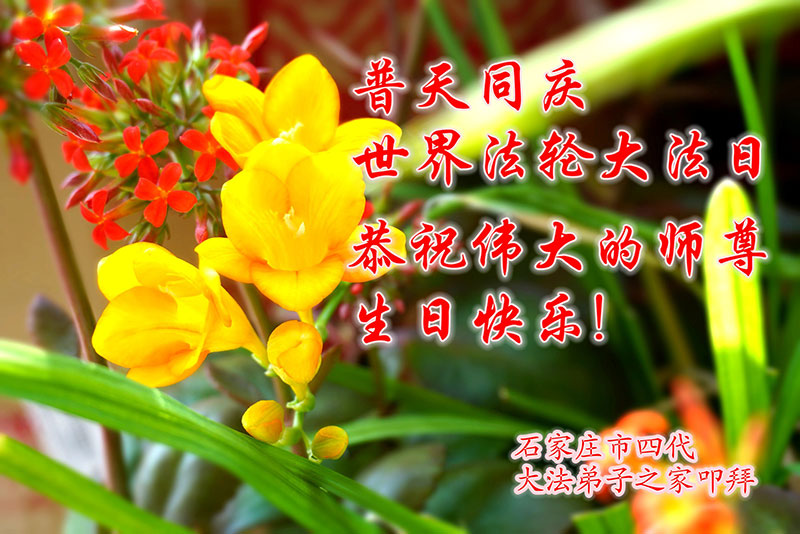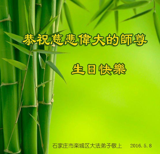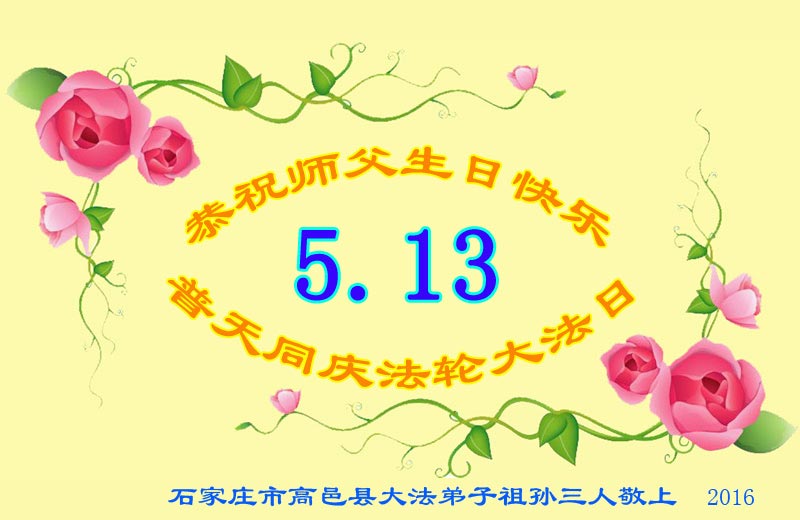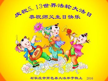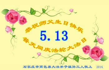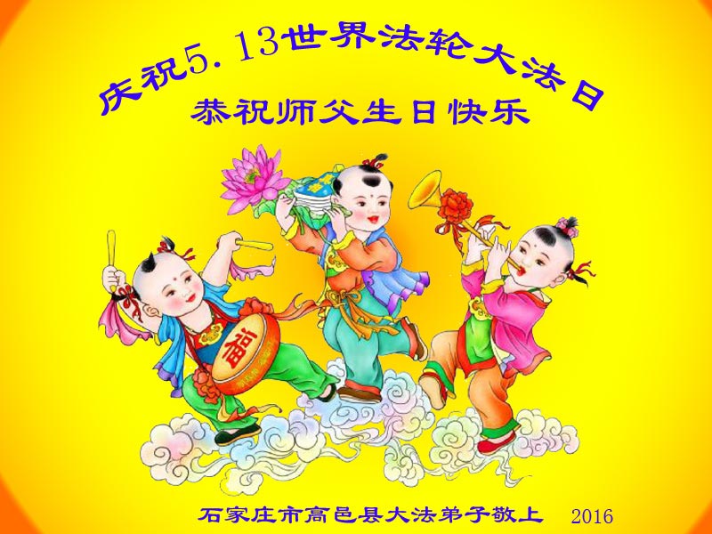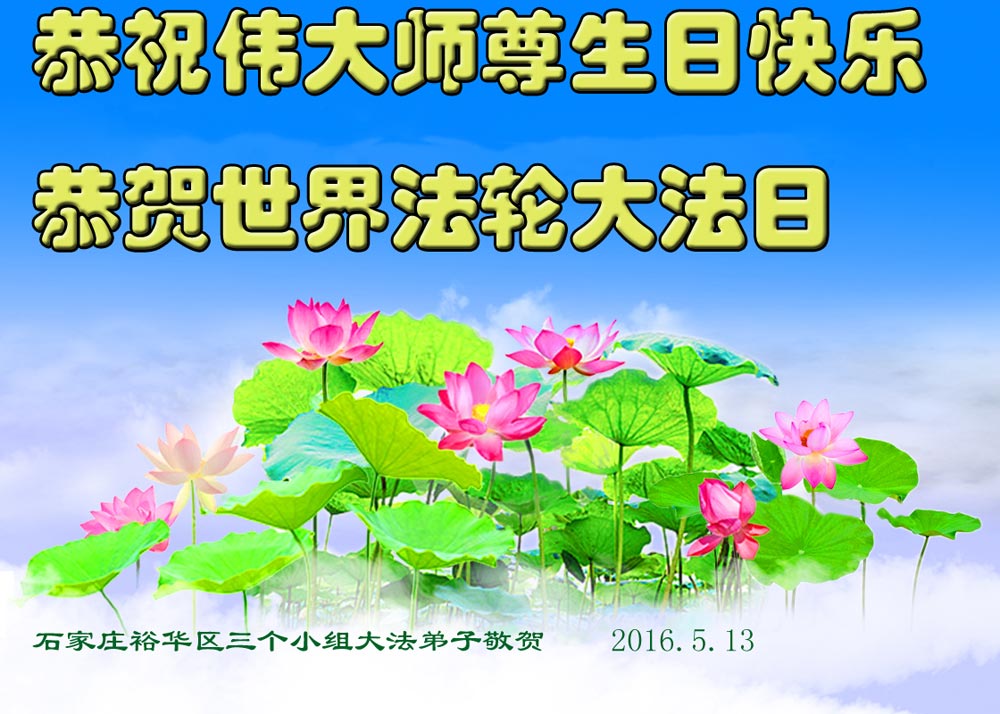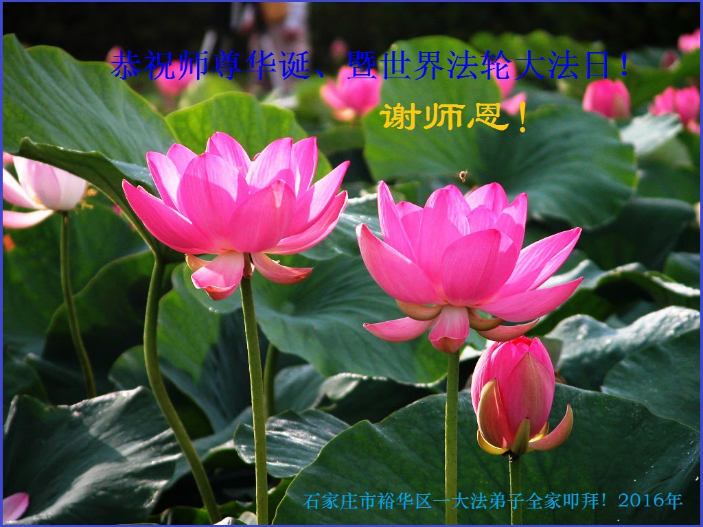 在二零一六年世界法輪大法日到來之際,想到師尊法正穹宇,救度蒼生和無量承受付出,心潮難平,用盡人間的語言也說不盡我們對師尊的無限感恩。我們在師尊的慈悲呵護、佛恩浩蕩下一路走來,是師尊把我們從地獄中撈起、洗淨,緊緊拉著我們的手走在隨師正法的修煉回歸路上,在神的路上我們雖有苦難,但內心充滿了幸福美好!我們由衷的對師尊說:師尊您辛苦了!我們是大法中的粒子,我們一定在偉大師尊以巨大承受為弟子和蒼生延續來的寶貴時間內,多學法學好法,時時處處以法為師,嚴肅地修好自己,以無私無我的心態快救人多救人,堅定的走正走穩走好正法路,兌現自己的史前誓約!