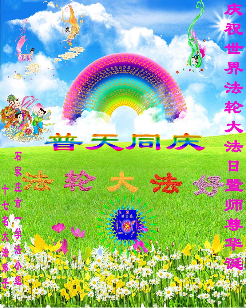 石家莊市一大法弟子攜一家九口人恭祝師父生日快樂!恭賀世界法輪大法日!