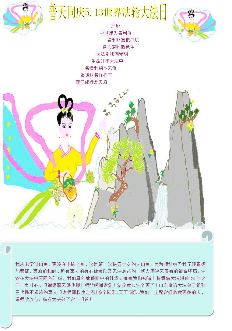 我從未學過畫畫,更沒在電腦上畫,這是第一次快五十歲的人畫畫,因為師父給予我無限福德與智慧、家庭的和睦、所有家人的身心健康以及無法表達的一切人間決無僅有的神奇經歷。生命在大法中無阻的昇華,我們真的就像畫中的昇華,唯有我們知道。特意借大法洪傳24年之日一表寸心。叩謝師尊無限佛恩!師父啊謝謝您!您救度眾生辛苦了!山東臨沂大法弟子祖孫三代攜不修煉的家人叩謝師尊救度之恩!蒼宇同樂、天下同樂。我們一定配合好救度更多的人,請師父放心。臨沂大法弟子合十叩首!