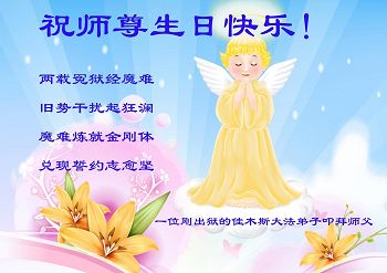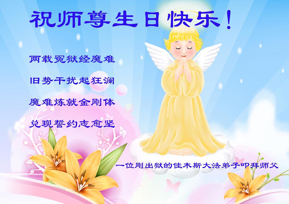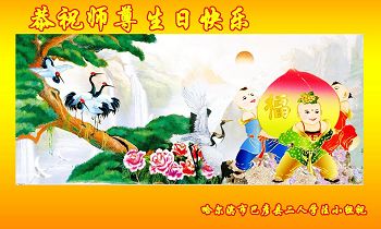 師父:您好!您辛苦了,是您的慈悲呵護,我們才能一步步走到了今天。在邪惡即將滅盡之時,我們迎來了您的華誕,傾盡人間所有的語言我們也無法表達出您對弟子的洪恩。弟子唯有精進,做好三件事,肩負起責任和使命,完成久遠誓願,才能不辜負您的慈悲苦度,圓滿隨師還。