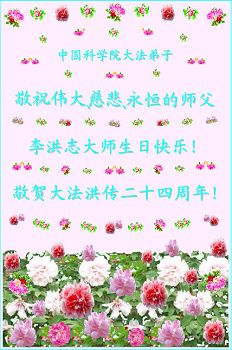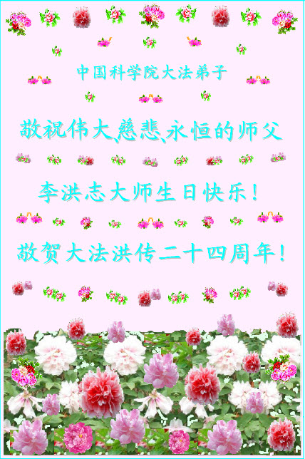 中國科學院大法弟子敬祝偉大、慈悲、永恆的師父李洪志大師生日快樂!敬賀大法洪傳二十四週年!