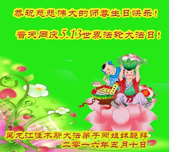 黑龍江佳木斯市大法弟子兩姐妹恭祝慈悲偉大的師尊生日快樂!
