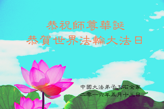 我們一家深受大法的洪恩,使得我們擁有第二次生命大法讓我們懂得人生的意義,使我們的生活快樂,大法不僅健康了我們的身體,更清洗了我們的思想,淨化了我們的心靈。在這普天同慶全世界法輪大法日暨偉大師尊65華誕的美好時刻,我們心懷對大法的感恩和對師尊的無比崇敬,衷心祝願偉大的師尊生日快樂!同時衷心祝願更多的世人都明大法的真相,三退保平安,都擁有美好的未來!