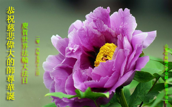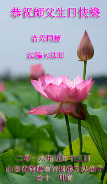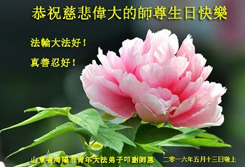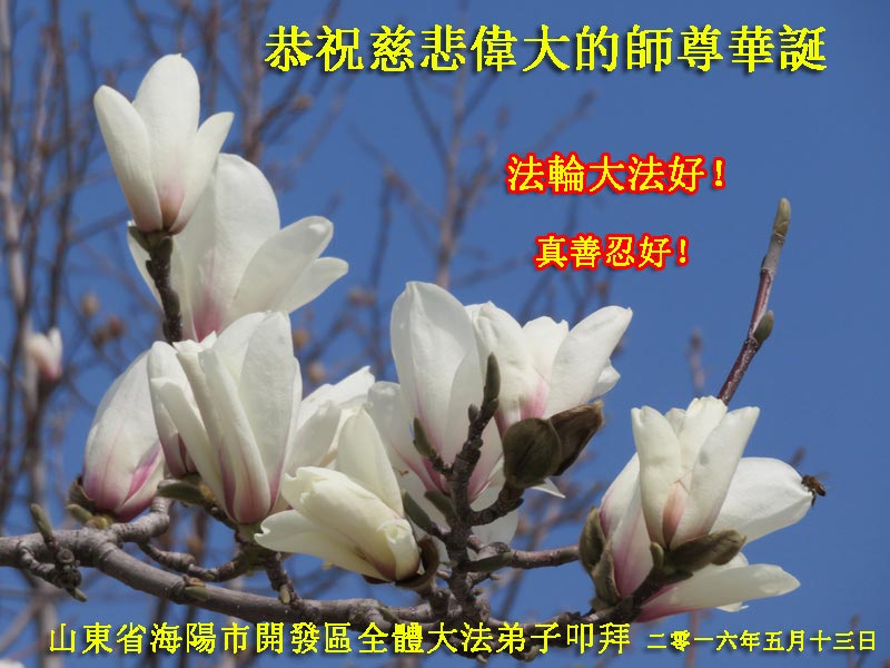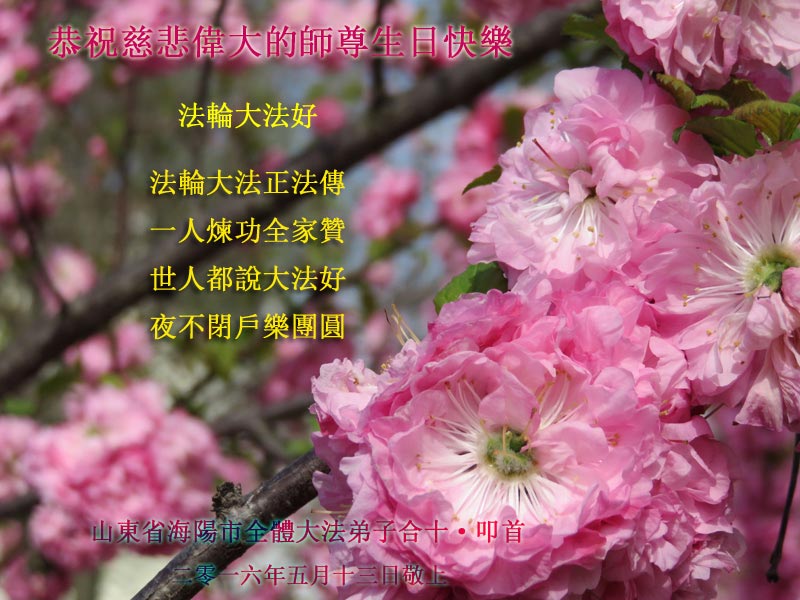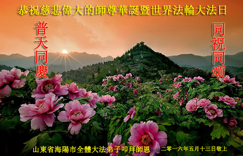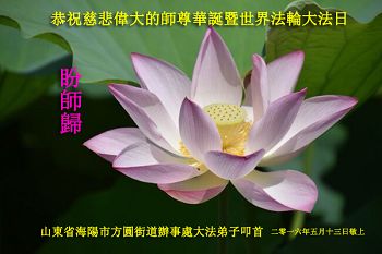 山東省煙台市海陽市開發區大法弟子恭祝慈悲偉大的師尊華誕暨世界法輪大法日!