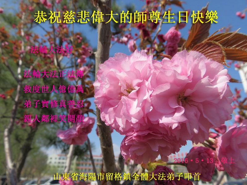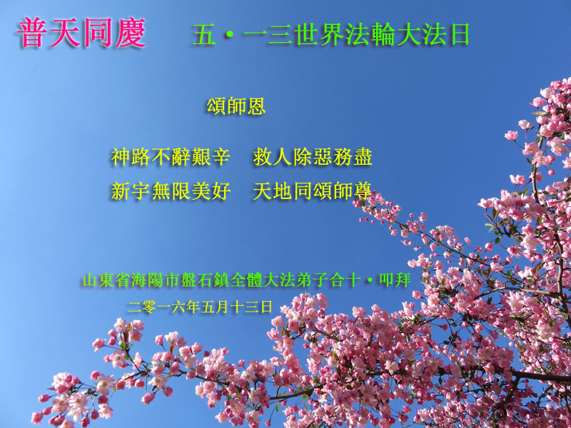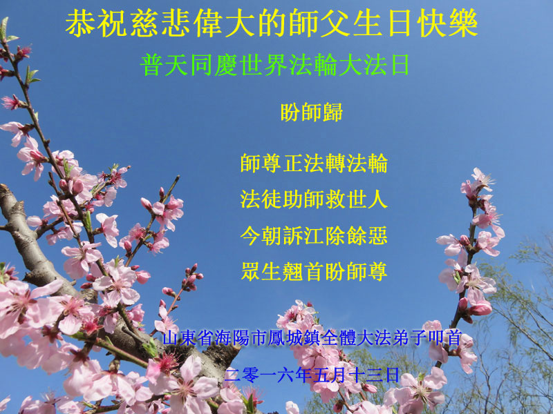 山東省煙台市海陽市磐石鎮大法弟子恭祝慈悲偉大的師尊華誕暨世界法輪大法日!