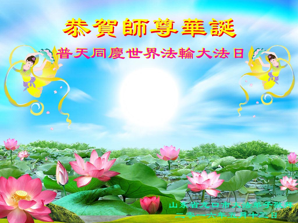 山東省煙台市龍口市大法弟子在此普天同慶五一三世界法輪大法日之際,恭祝慈悲偉大的師尊生日快樂!