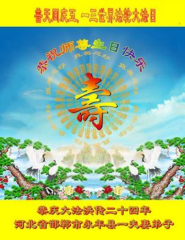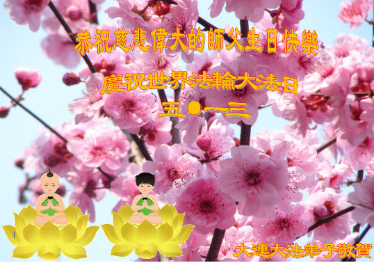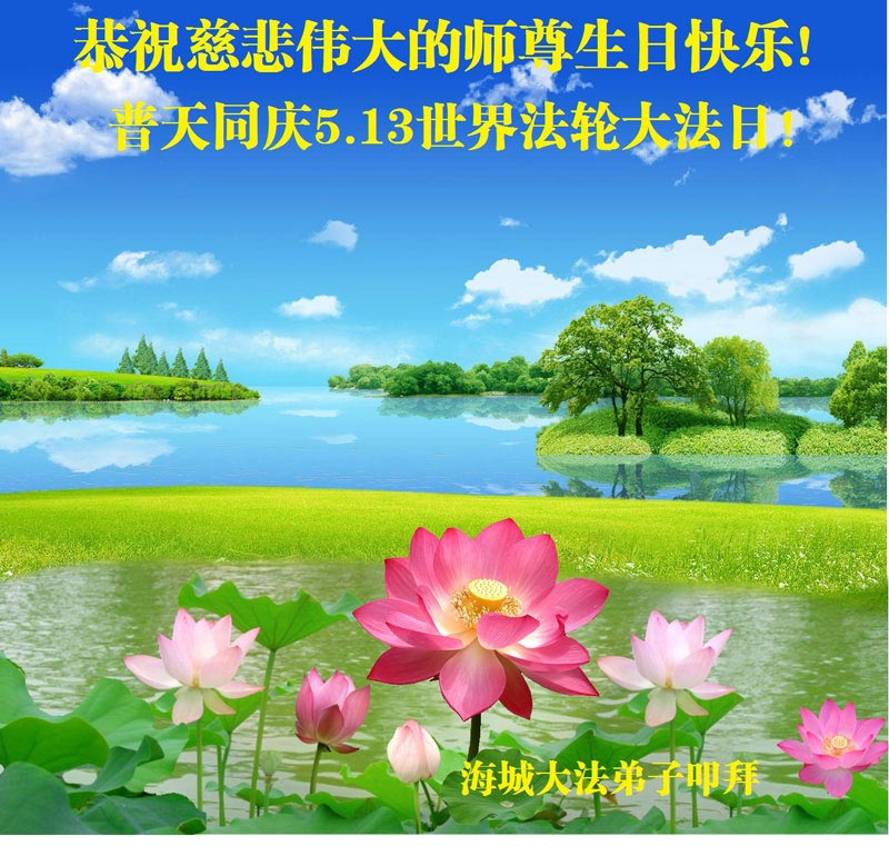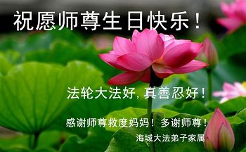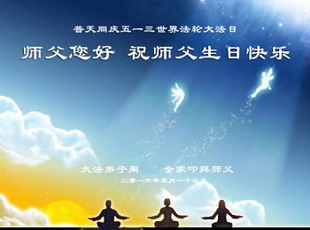 在這普天同慶、同頌師父生日,師父傳法二十四週年及世界法輪大法日之際,弟子叩拜師父:恭祝師父生日快樂!師父辛苦了!