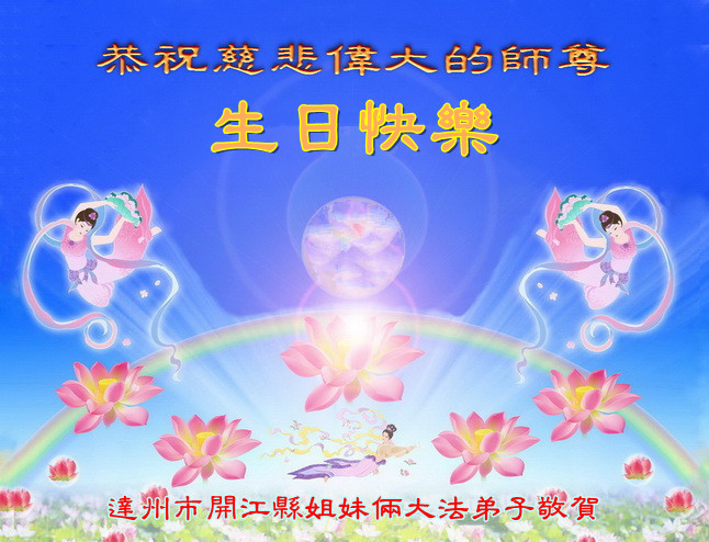 四川省達州市開江縣姐妹倆大法弟子恭祝慈悲偉大的師尊生日快樂!