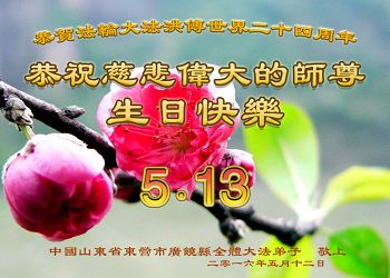 山東撫順一大法弟子恭祝慈悲偉大的師尊生日快樂!慶祝5.13世界法輪大法日!