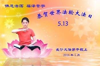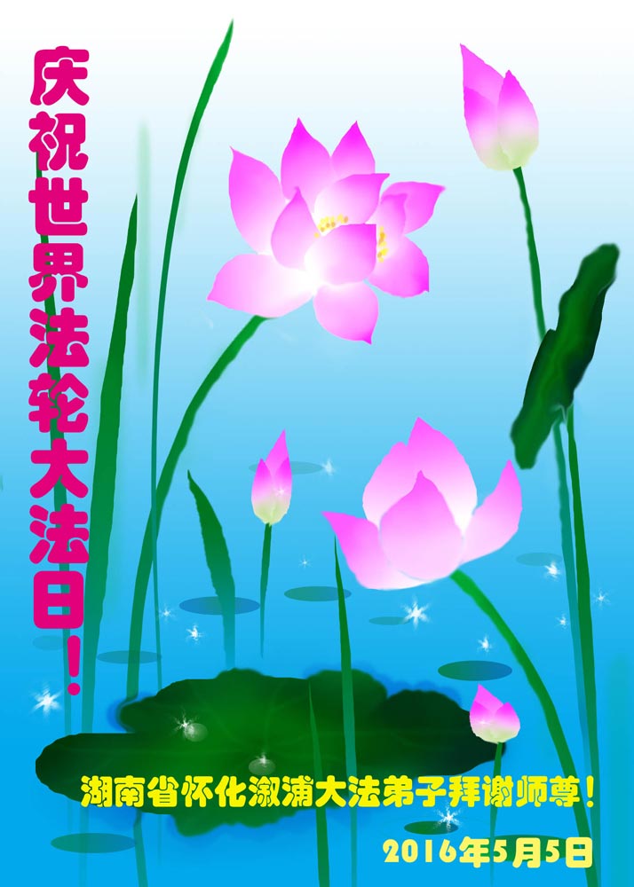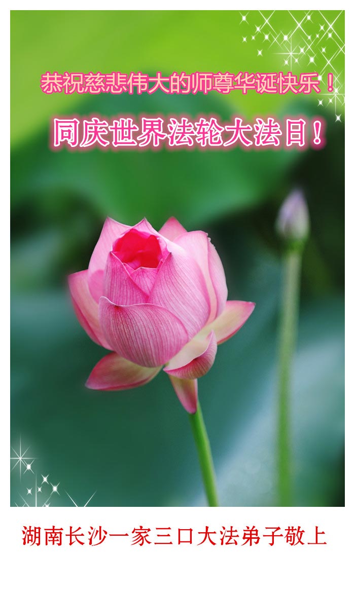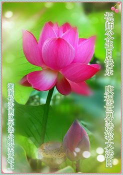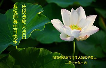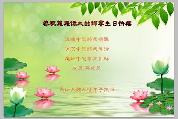 在這普天同慶同賀同頌的日子裏,為世界法輪大法日而慶賀,為迎來慈悲偉大的師尊華誕而慶賀!為我們能成為正法時期的大法徒而感到無比自豪和幸福。眾生在覺醒,邪黨在解體!慈悲而偉大的師父啊!我們大陸大法弟子想念您!盼師父早日回國!千言萬語難以表達弟子們對師父的感激之情,唯有多救眾生與精進實修。