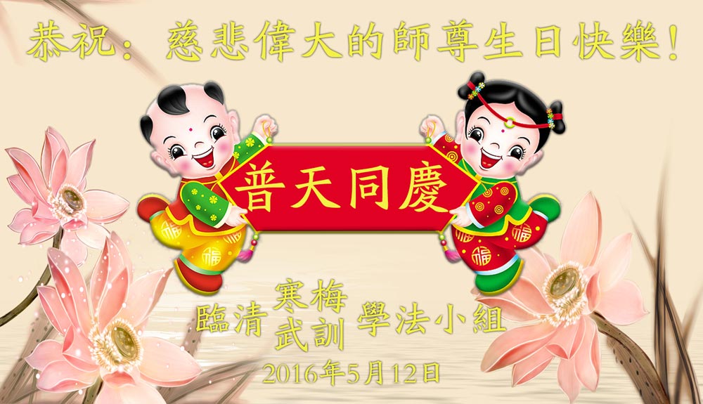 在這普天同慶「五一三」世界法輪大法日暨師尊華誕的聖日裏,我們學法小組全體大法弟子恭祝:法輪大法洪傳二十四週年!恭祝慈悲偉大的師尊六十五華誕!