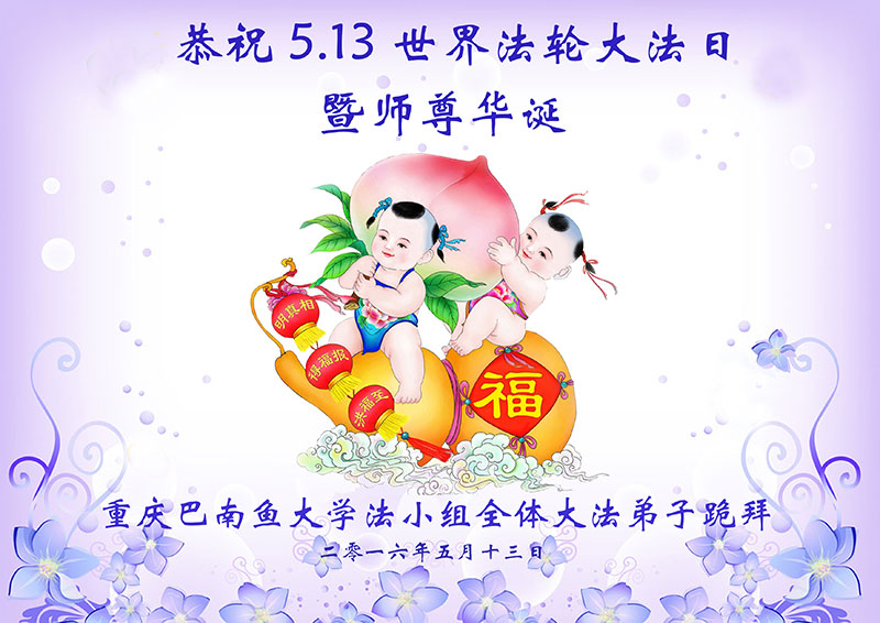 重慶市巴南魚大學法小組全體大法弟子恭祝師父生日快樂!普天同慶五一三世界法輪大法日!