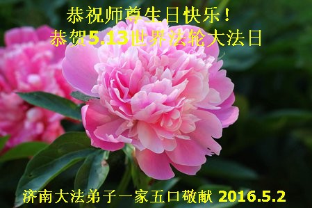 山東省濟南大法弟子一家五口恭祝師尊生日快樂!恭賀5.13世界法輪大法日!