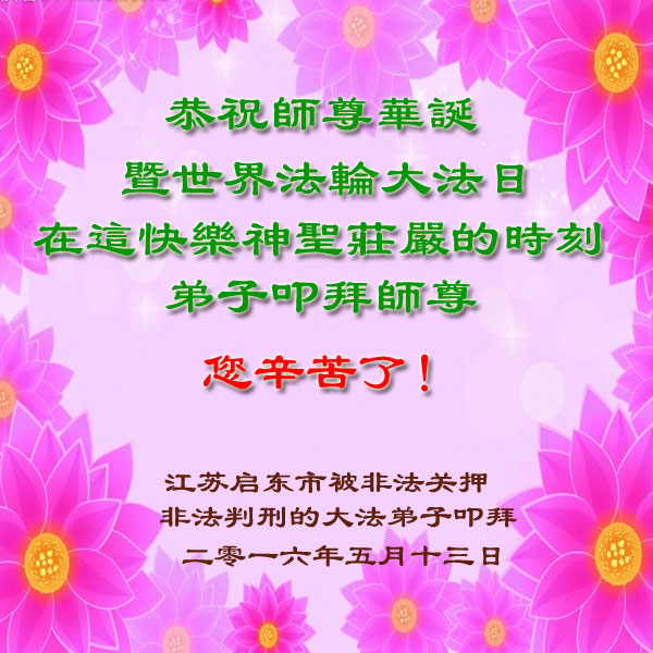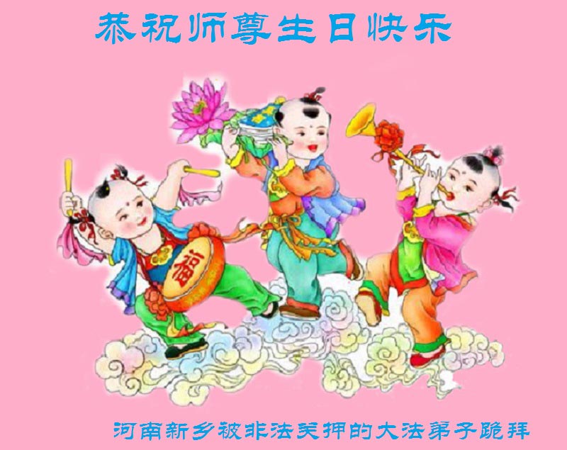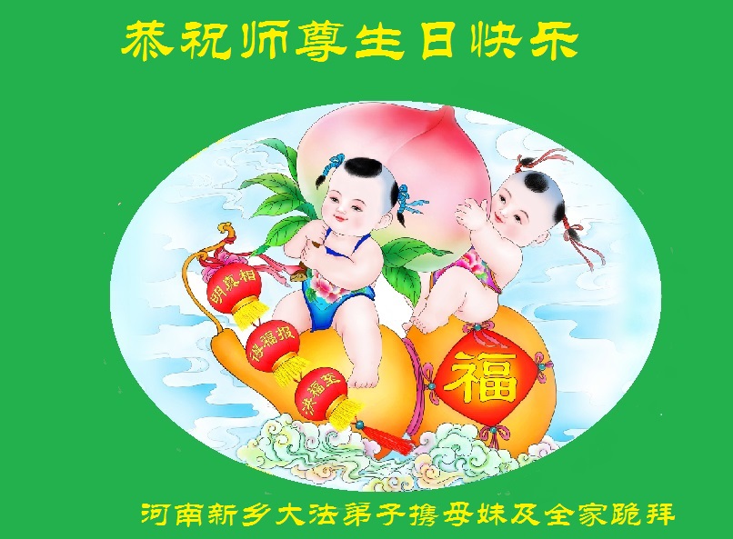 師尊您好!師父辛苦了!弟子和剛剛得法修煉的親人們恭祝您生日快樂!在這普天同慶、同祝、同頌的偉大節日裏,我們億萬大法弟子沐浴在師恩浩蕩中,弟子們榮幸之極,令滿穹宇眾生都羨慕不已。師父的大恩大德,弟子無以為報,只有在實修中勇猛精進,把對師父的思念與感恩化作精進的動力,在正法的最後時刻做好三件事,多傳大法真相,多救眾生來感謝師父慈悲救度之恩!願師尊少一份操勞,多一些欣慰,唯願師尊笑!