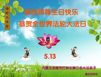 內蒙古赤峰市巴林左旗三名大法弟子恭祝師尊生日快樂!恭賀全世界法輪大法日!