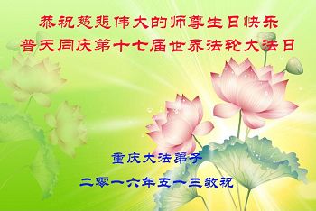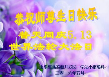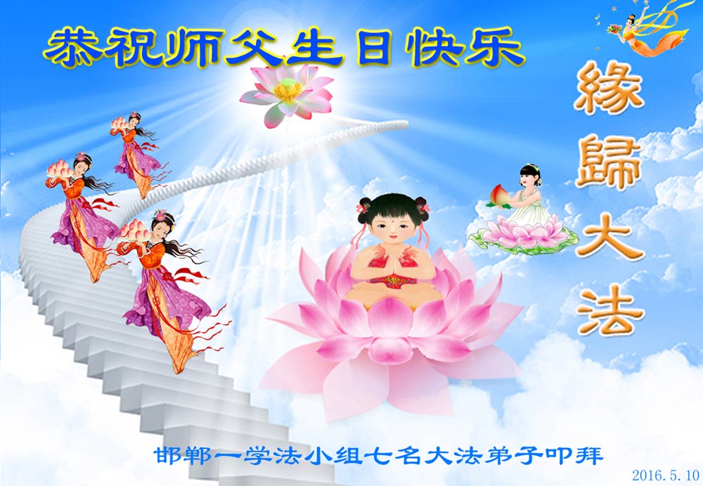 我是河北農村大法弟子,在2016年5月13日法輪大法日來臨之際,我們學法點全體大法弟子恭祝慈悲偉大的師父生日快樂!