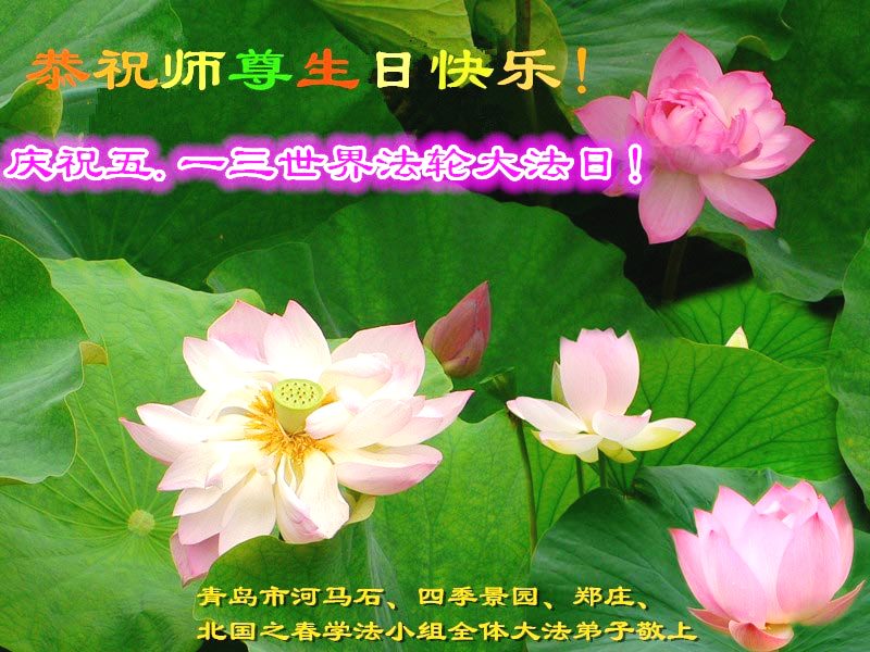 青島河馬石、四季景園、鄭莊、北國之春全體大法弟子恭祝師尊生日快樂!普天同慶五一三世界法輪大法日!