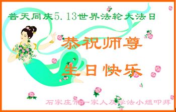 值此513世界法輪大法日暨師尊華誕之際,我們學法小組全體大法弟子恭祝師尊生日快樂!聽師尊的話,做好三件事,在實修和多救人上下功夫。謝謝師尊的慈悲救度!弟子叩謝師尊!