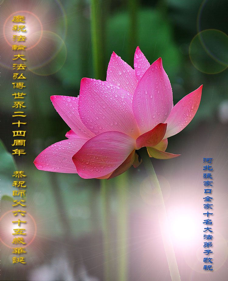 我們夫妻是北京延慶的大法弟子,共同祝賀師尊壽誕。十多年的修煉中,給師尊添了不知多少麻煩。沒有師尊的浩蕩洪恩我們甚麼也不是,甚麼也做不了。是慈悲的師尊改變了我們下地獄的命運,並賦予了我們助師正法的神聖使命,讓我們成為宇宙中和師父正法同在,和宇宙同存,再不可能有的「正法時期大法弟子」稱號的生命。我們會加倍珍惜這不會再有的時機,在今後的時間裏要多學法、多救人,修好自己,跟師尊回家,來報答師尊的慈悲苦度。在全宇宙同慶之時,我們在北京給慈悲師尊叩頭,向慈悲師尊說一聲:師尊您好!您辛苦了。弟子想念你。