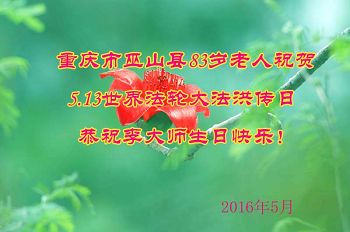 我是大陸大法弟子家庭中一名明白真相、相信法輪大法、支持法輪大法的一位得救眾生。五月十三日是您六十五歲華誕生日,也是世界法輪大法日,在這幸福美好的日子裏,遙祝李老師生日快樂!李老師救度天下眾生辛苦了!非常感激李老師救度了我的爺爺奶奶,他們以前身體疾病纏身,修了大法後,身體健康,精神愉快。我和爸爸媽媽在您的佛恩浩蕩中受益匪淺。