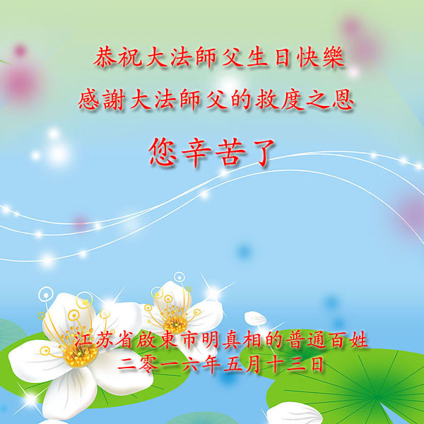 感謝李大師能教導出這麼多能按照真善忍做人做事的好弟子,我雖然沒修煉,但是我非常認同真善忍的理念,並且從中我也受益頗多。在這普天同慶的日子裏,誠摯的恭祝李大師生日快樂!同賀513世界法輪大法日!