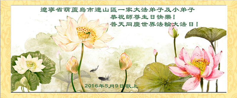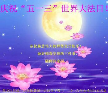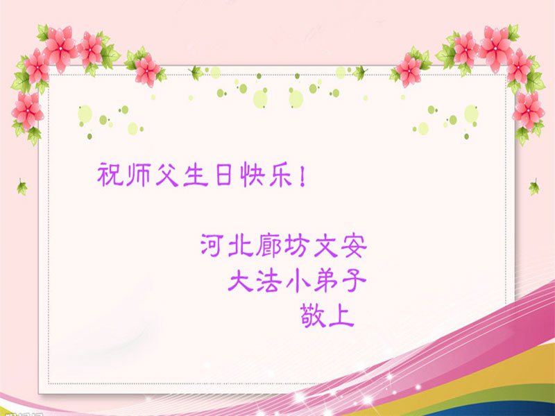 我們全家大法弟子叩拜偉大的師父,恭祝師父生日快樂!恭賀法輪大法日!我們一定會跟隨師父堅定的走完以後的路。再一次感謝偉大的師父!