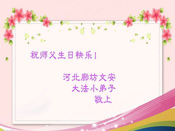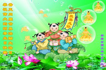 感謝師尊的慈悲的苦度!我是九六年九月得法的弟子,在做好您安排的三件事中,時時都感到恩師慈悲呵護和點悟。在今後的修煉歷程中唯有精進實修多救人和帶好大法小弟子以報師恩 !
