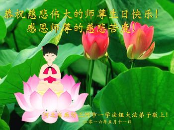 二十多年來,三河市大法弟子一直沐浴著師尊的佛恩浩蕩,努力做好三件事,兌現著助師正法的神聖誓約。在十七屆世界法輪大法日這普天同慶的偉大節日,我們全體大法弟子叩拜師尊的慈悲苦度!恭祝師尊生日快樂!