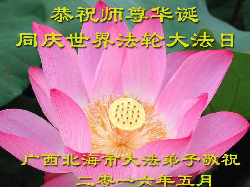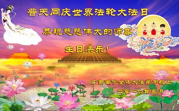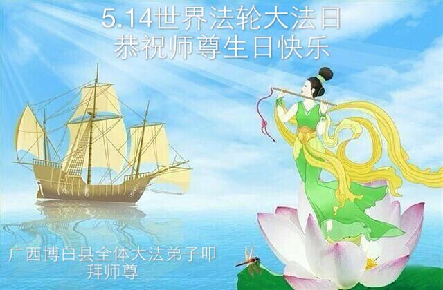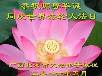 弟子感恩師尊救度,一定要做好三件事,多救人,謝師恩!廣西壯族自治區北海市合浦縣大法弟子向師父獻上最誠摯的敬意和祝福:恭祝慈悲偉大的師父生日快樂!並同祝世界法輪大法日!
