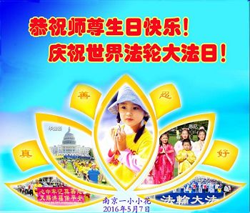 江蘇省南京一小小花恭祝師尊生日快樂和慶祝世界法輪大法日!