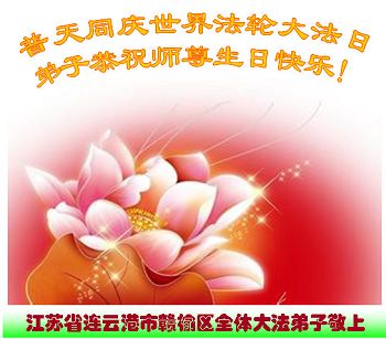 江蘇省連雲港市贛榆地區大法弟子恭祝慈悲偉大的師尊生日快樂!普天同慶世界法輪大法日!祝賀法輪大法洪傳世界二十四週年!