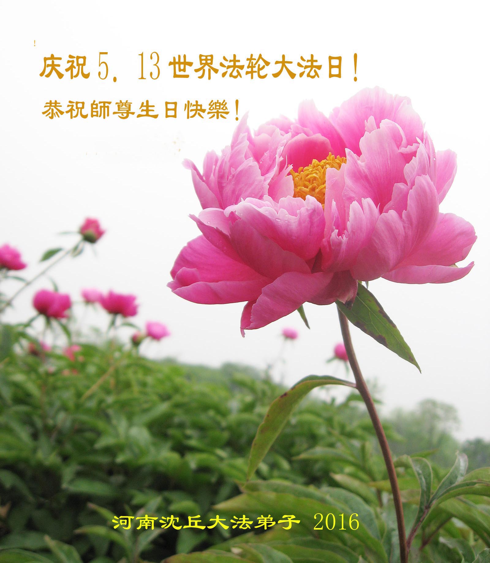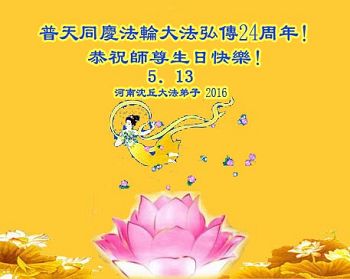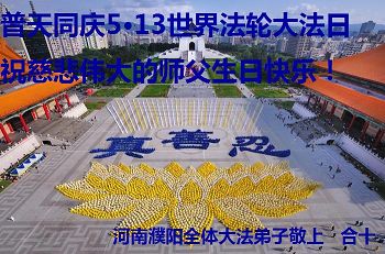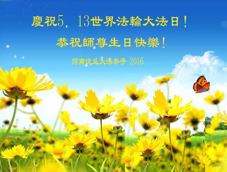 師父!感謝您的慈悲救度!在法輪大法洪傳24週年之際,我們沈丘全體大法弟子向慈悲偉大的師父叩拜!恭祝師尊生日快樂!在正法的最後時刻,我們一定精進實修,緊跟師尊正法進程!