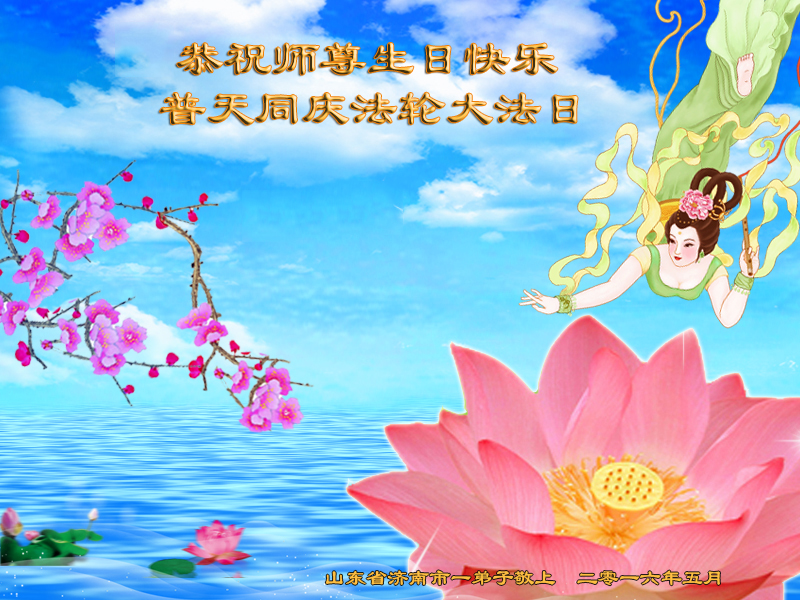 普天同慶、同賀慈悲偉大的師尊生日快樂!普天同慶、同賀第十七個世界法輪大法日的到來!是師尊帶著永世不變的大法拯救了整個宇宙,是師尊不嫌棄我們的愚鈍與滿身的骯髒,洗淨了我們並一步一步的引領著我們前行,是師尊的大法讓我們看到了人類光明的希望,(師尊我冒昧的稱自己是您的弟子,因我感覺自己還沒有達到師尊大法的要求)弟子無法用現在的語言來表達我內心的感激、感恩的心情。只有在正法結束前,按照大法做,修去自身一切不符合大法的東西,做好三件事,願能成為師尊承認的大法弟子。