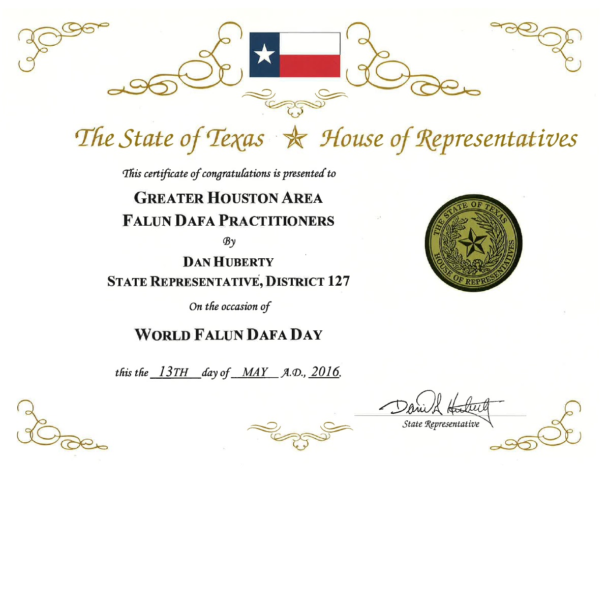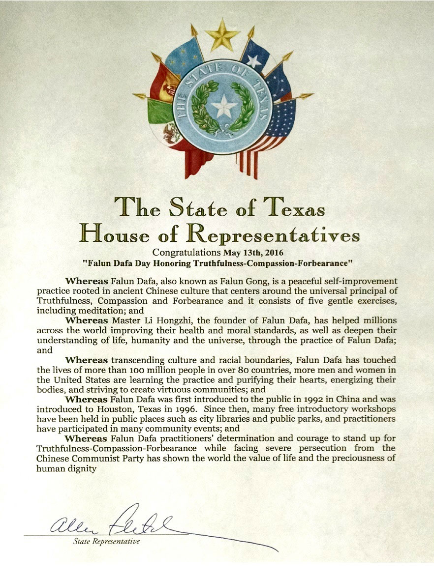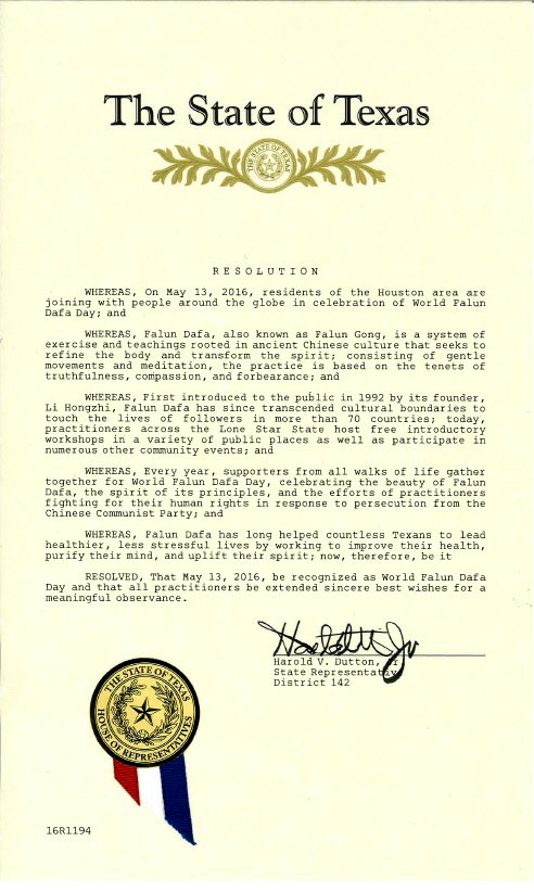 德克薩斯州州眾議院祝賀二零一六年五月十三日世界法輪大法日及讚美「真、善、忍」