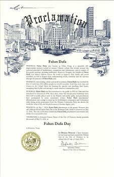 鑑於,法輪大法於一九九二年首次在中國傳播,一九九六年洪傳至休士頓。自此以後,在圖書館和公園舉行許多法輪大法免費學習班,法輪大法修煉者參加了許多社區活動。面臨著來自中國共產黨的殘酷迫害,法輪大法修煉者以決心和勇氣堅守真、善、忍,向世界展示了生命的價值和人性的尊嚴。