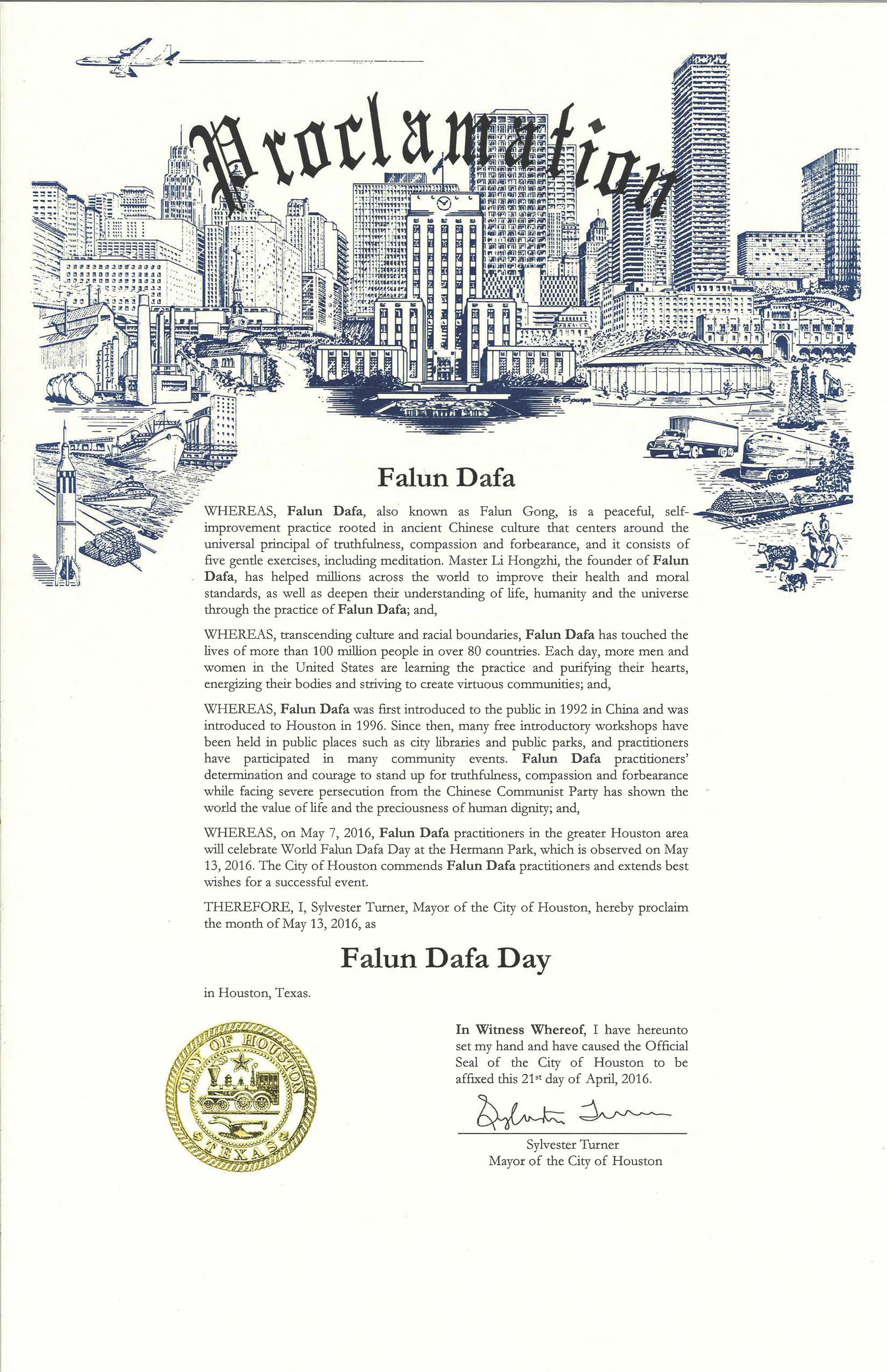 休士頓(Houston)市長西爾威斯特﹒杜南(Sylvester Turner)為此頒發褒獎,讚揚法輪大法給人們帶來的福祉,並宣布二零一六年五月十三日為「法輪大法日」。