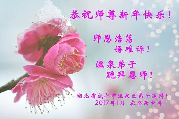 我們是四川省成都市溫江區三個學法小組的大法弟子,在這新年即將到來之際,我們非常非常想念師父,在此向師父拜年!並恭祝師父新年好!新年快樂!