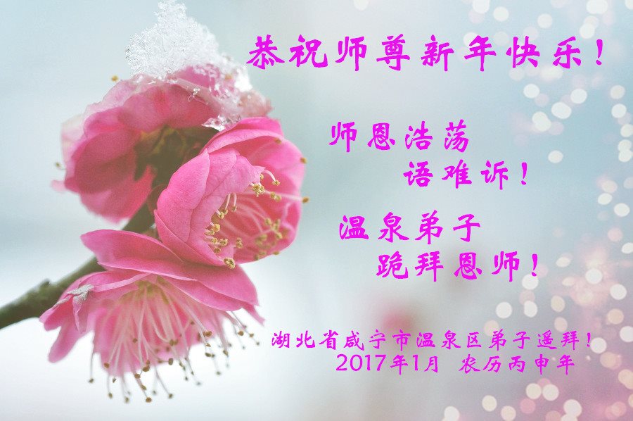 轉瞬又一新年到了,師尊為救宇宙眾生辛苦了!弟子們恭祝慈悲偉大的師尊新年好!新年快樂!弟子無限感謝師尊對我們的慈悲救度和一路細心看護。現在我們的修煉是師尊用巨大的承受為弟子換來的修煉時間的有限延續,弟子一定珍惜這珍貴的有限修煉時間,努力修好自己,放下一切人心執著觀念,持續做好三件事,多救眾生,努力完成使命,做一個真修弟子,不辜負師尊的慈悲苦度。