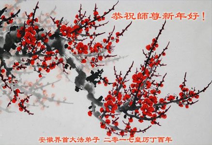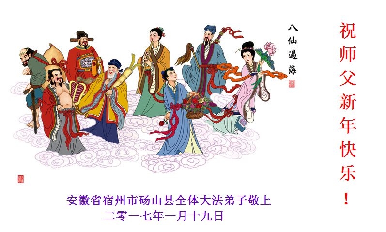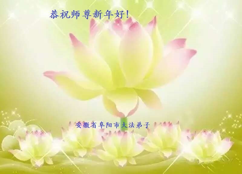 2017新年到來之際,我們安徽界首全體大法弟子恭祝師尊新年好!並感謝師父的慈悲救度之恩!在弟子們修煉中,任何點滴都離不開師父的點悟與看護。因此我們全體大法弟子決心在2017年的修煉中向內找、去掉所有人心和執著,在法中正悟,堅決修好自己,不辱來世的使命,兌現誓約。